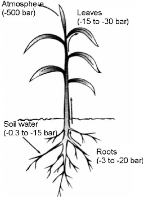 For example, soil water has an osmotic potential of about -20, while plant roots have about -40. This means soil water (“mother”) moves toward roots (“child”), bringing nutrients and water. Next, the stem has an osmotic potential around -60, so water moves from roots to stem, and then to leaves with osmotic potential near -100. Buds, fruits, and flowers have even more negative osmotic potentials, driving nutrient flow into them. Ultimately, water moves up to the atmosphere, which can have an osmotic potential as low as -500, especially under dry, sunny conditions.